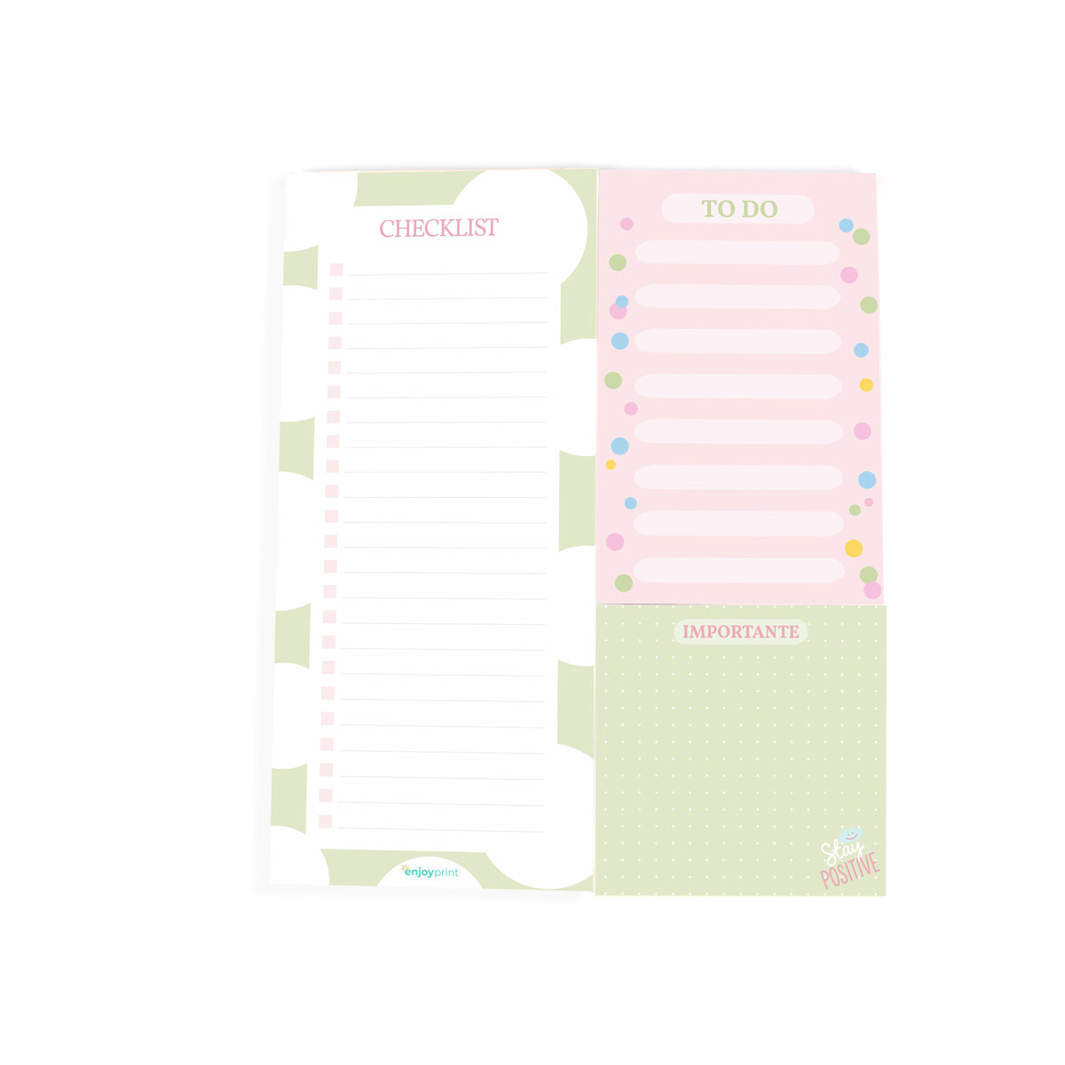Apresentando o "Trio Bloco de Notas - Stay Positive", a combinação perfeita de funcionalidade e inspiração. Com três designs essenciais - Checklist, To do e Importante - este conjunto foi meticulosamente projetado para ser seu aliado diário, ajudando-o a priorizar tarefas, registrar metas e destacar os pontos cruciais.